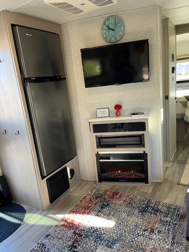 Birkey water filter and basic spices. Features a full-size RV fridge and